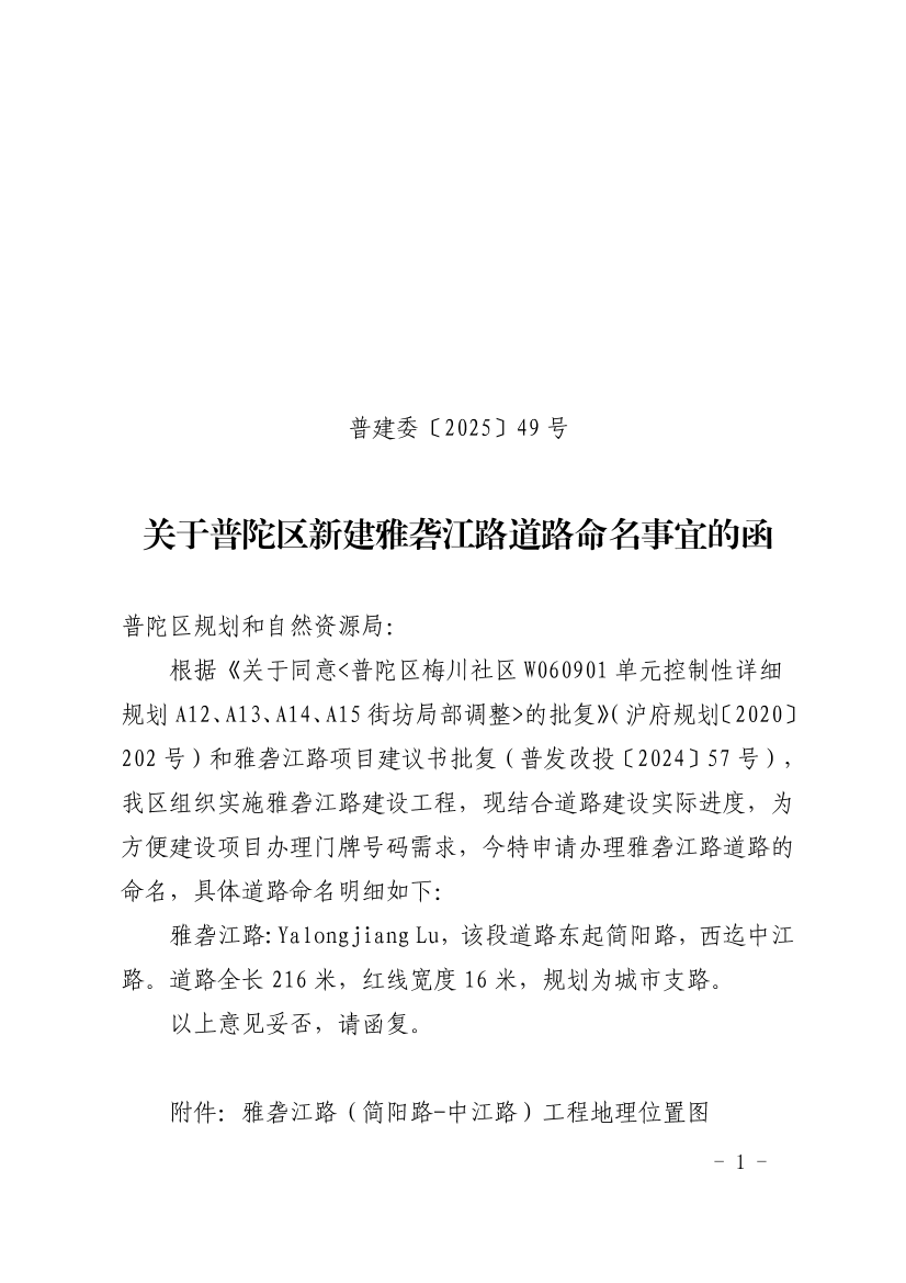 根据《关于同意<普陀区梅川社区W060901单元控制性详细规划A12、A13、A14、A15街坊局部调整>的批复》(沪府规划〔2020〕202号)和雅砻江路项目建议书批复(普发改投〔2024〕57号),我区组织实施雅砻江路建设工程,现结合道路建设实际进度,为方便建设项目办理门牌号码需求,今特申请办理雅砻江路道路的命名,具体道路命名明细如下: