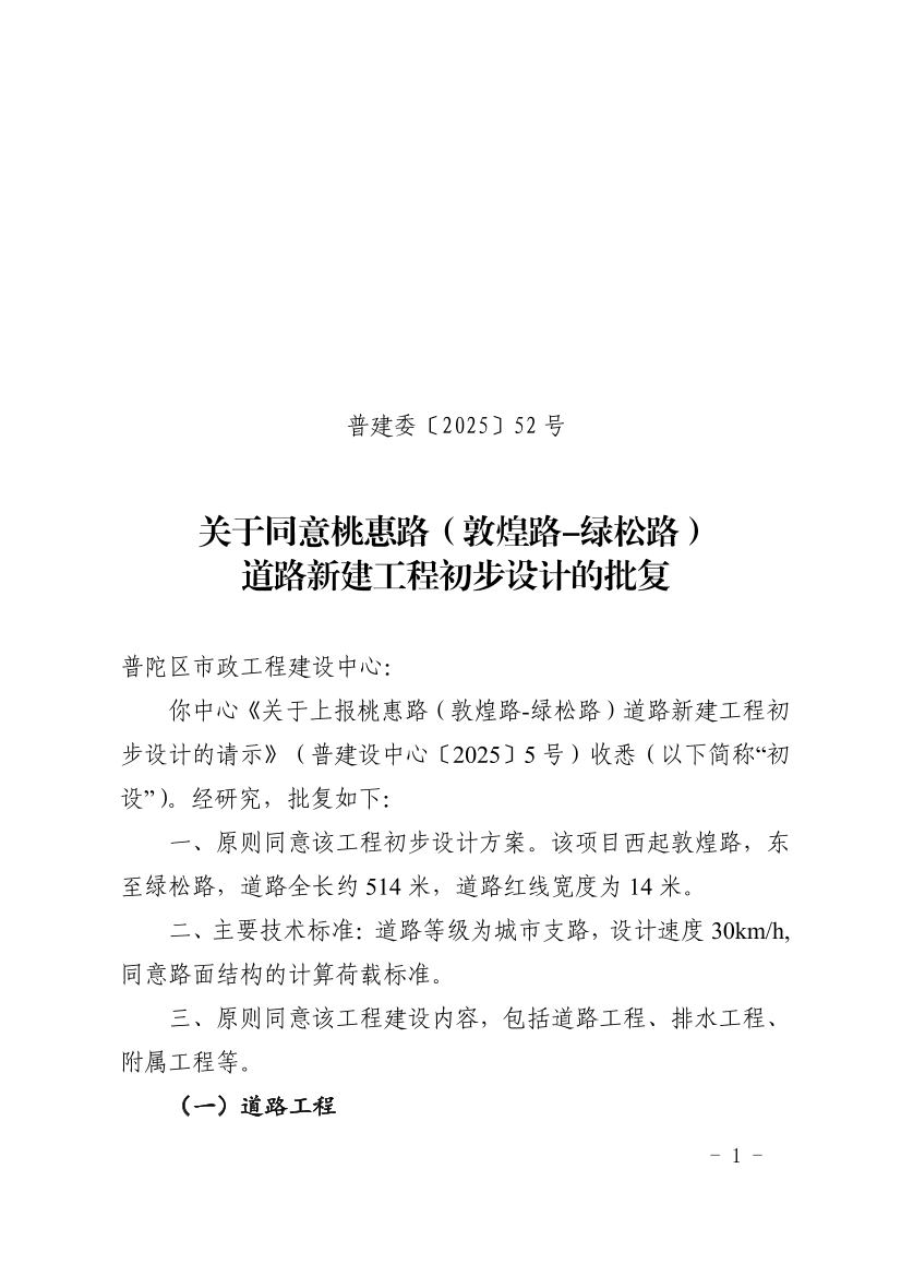 你中心《关于上报桃惠路(敦煌路-绿松路)道路新建工程初步设计的请示》(普建设中心〔2025〕5号)收悉(以下简称“初设”)。经研究,批复如下: