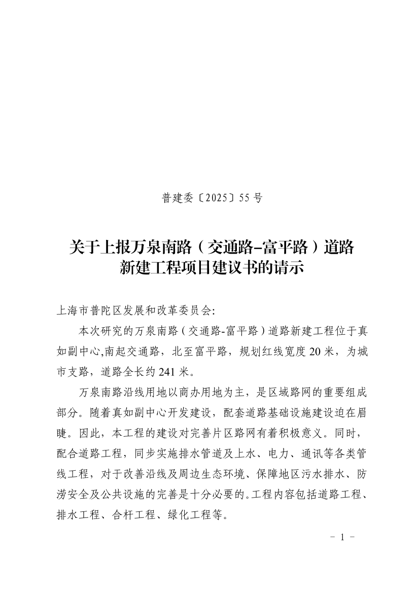 本次研究的万泉南路(交通路-富平路)道路新建工程位于真如副中心,南起交通路,北至富平路,规划红线宽度20米,为城市支路,道路全长约241米。