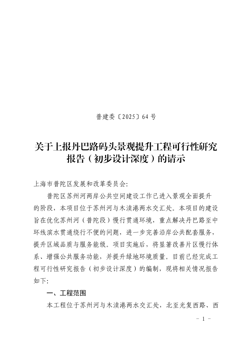 普陀区苏州河两岸公共空间建设工作已进入景观全面提升的阶段,本项目位于苏州河与木渎港两水交汇处。本项目的建设旨在优化苏州河(普陀段)慢行贯通环境,重点解决丹巴路至中环线滨水贯通绕行不便的问题,进一步完善沿岸公共配套服务,提升区域品质与服务能级。项目实施后,将显著改善片区慢行体系、增强公共服务功能,并提升绿地环境质量。目前已经完成工程可行性研究报告(初步设计深度)的编制,现将相关情况报告如下: