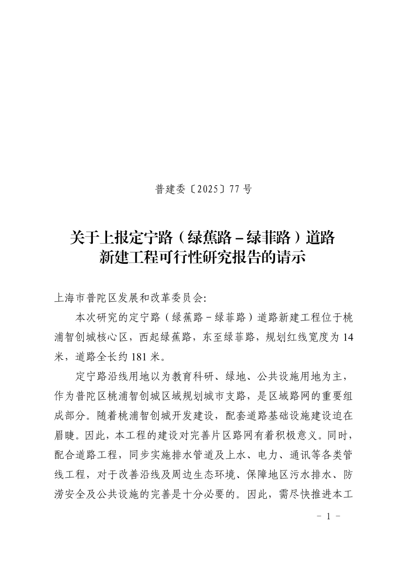 根据普发改投〔2024〕92号文《普陀区政府投资建设项目项目建议书批复表》相关要求,目前已完成《定宁路(绿蕉路-绿菲路)道路新建工程可行性研究报告》的编制,工程概况如下: