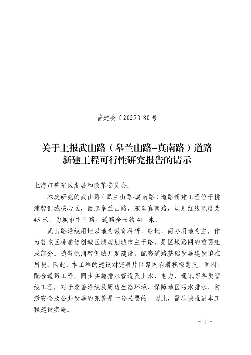 根据普发改投〔2024〕91号文《普陀区政府投资建设项目项目建议书批复表》相关要求,目前已完成《武山路(皋兰山路-真南路)道路新建工程可行性研究报告》的编制,工程概况如下: