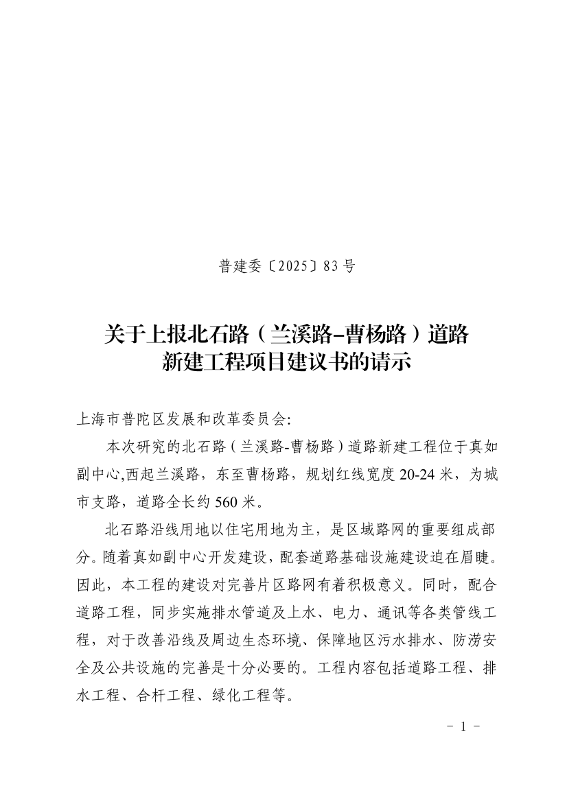 关于上报北石路(兰溪路-曹杨路)道路新建工程项目建议书的请示