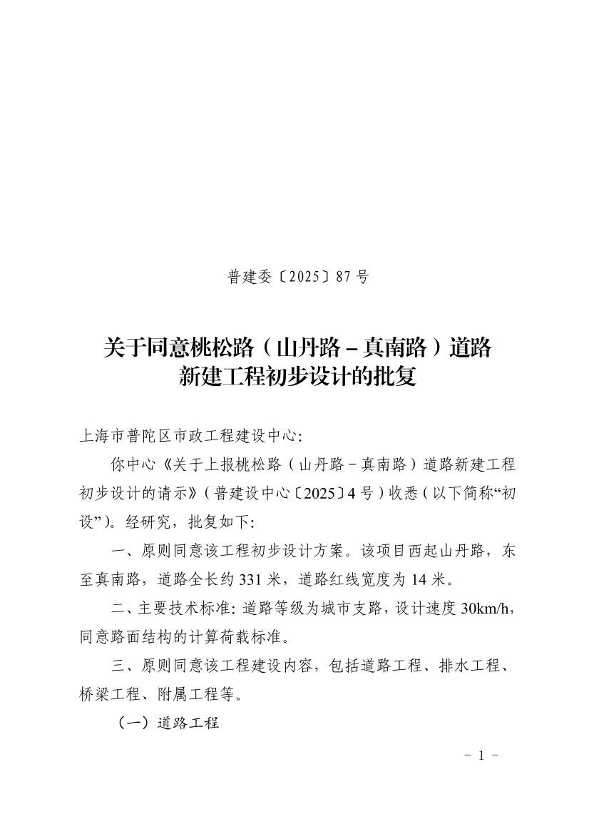 你中心《关于上报桃松路(山丹路-真南路)道路新建工程初步设计的请示》(普建设中心〔2025〕4号)收悉(以下简称“初设”)。经研究,批复如下: