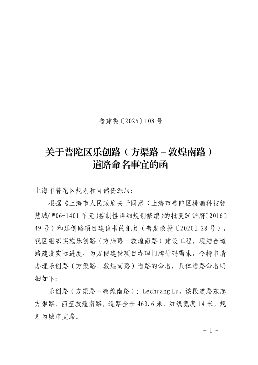 根据《上海市人民政府关于同意〈上海市普陀区桃浦科技智慧城(W06-1401单元)控制性详细规划修编〉的批复》(沪府〔2016〕49号)和乐创路项目建议书的批复(普发改投〔2020〕28号),我区组织实施乐创路(方渠路-敦煌南路)建设工程,现结合道路建设实际进度,为方便建设项目办理门牌号码需求,今特申请办理乐创路(方渠路-敦煌南路)道路的命名,具体道路命名明细如下: