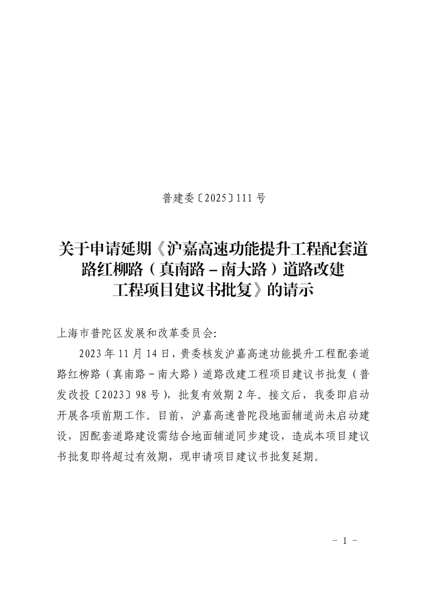 关于申请延期《沪嘉高速功能提升工程配套道路红柳路(真南路-南大路)道路改建工程项目建议书批复》的请示