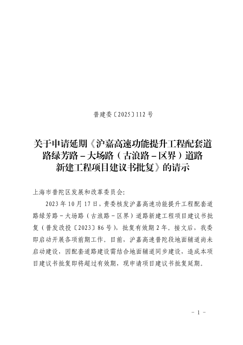 关于申请延期《沪嘉高速功能提升工程配套道路绿芳路-大场路(古浪路-区界)道路新建工程项目建议书批复》的请示