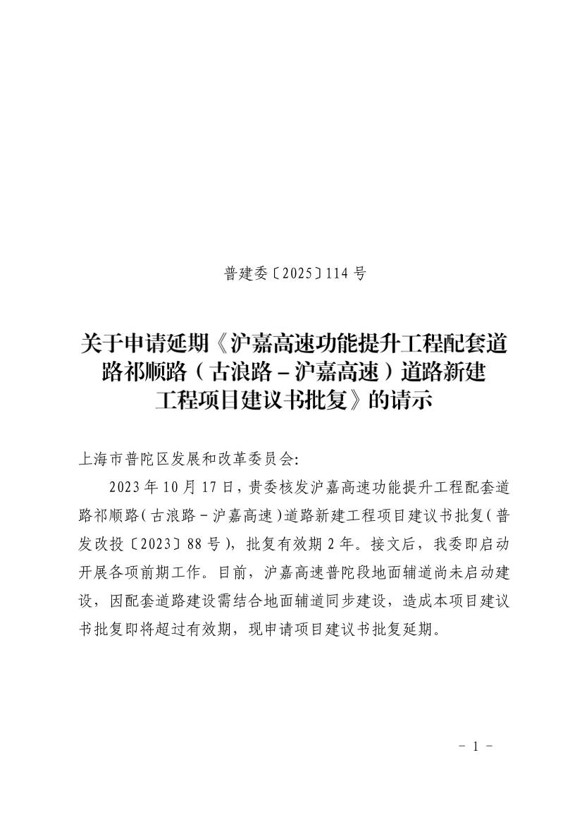 2023年10月17日,贵委核发沪嘉高速功能提升工程配套道路祁顺路(古浪路-沪嘉高速)道路新建工程项目建议书批复(普发改投〔2023〕88号),批复有效期2年。接文后,我委即启动开展各项前期工作。目前,沪嘉高速普陀段地面辅道尚未启动建设,因配套道路建设需结合地面辅道同步建设,造成本项目建议书批复即将超过有效期,现申请项目建议书批复延期。