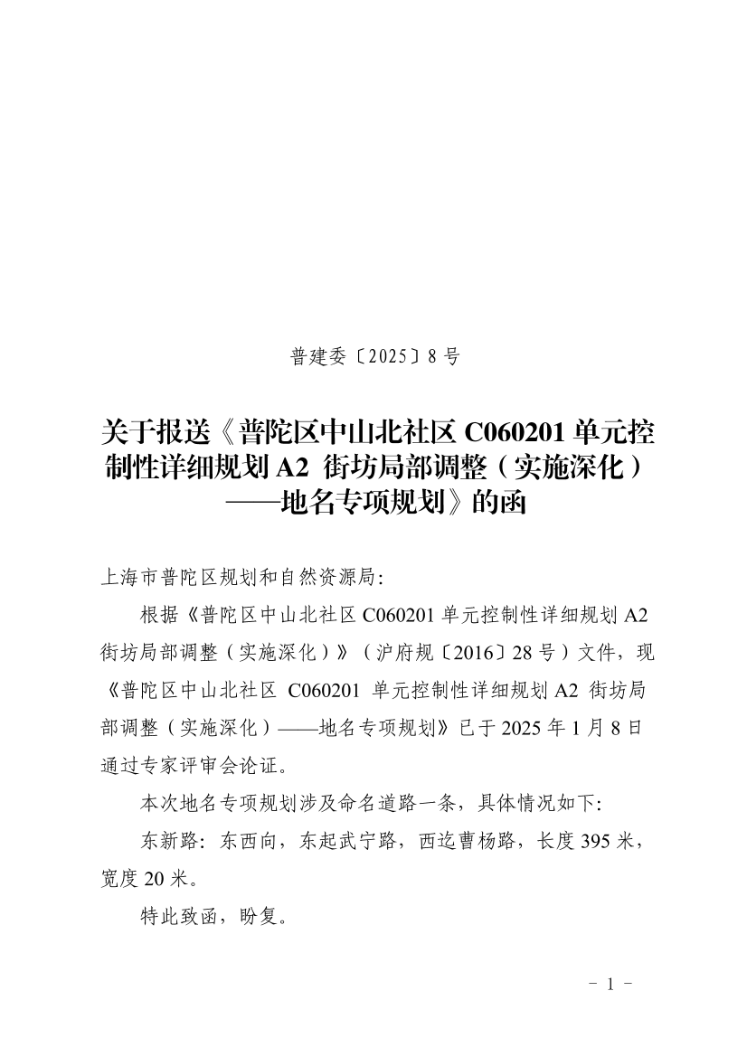 关于报送《普陀区中山北社区C060201单元控制性详细规划A2 街坊局部调整(实施深化) ——地名专项规划》的函