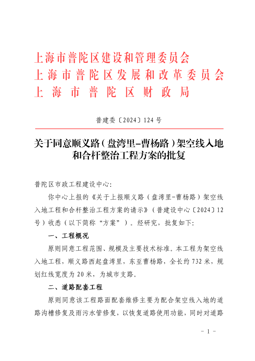 你中心上报的《关于上报顺义路(盘湾里-曹杨路)架空线入地工程和合杆整治工程方案的请示》(普建设中心〔2024〕12号)收悉(以下简称“方案”)。经研究,批复如下: