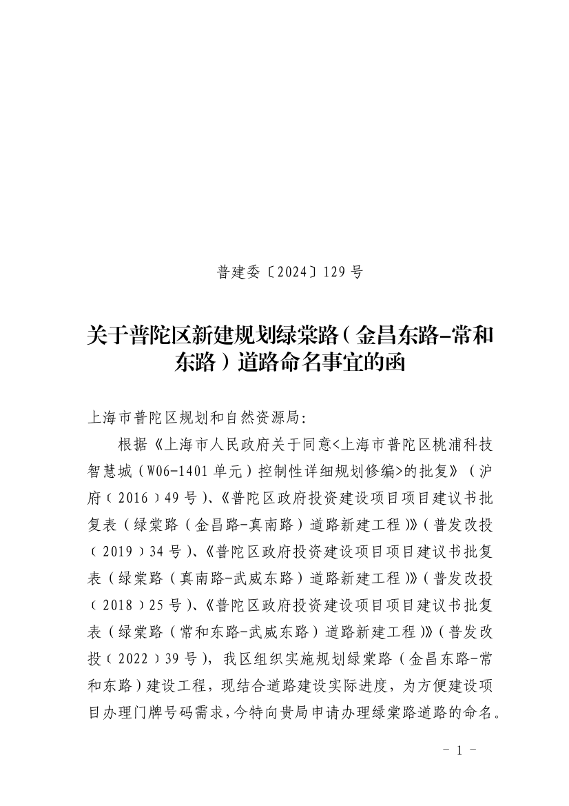 关于普陀区新建规划绿棠路(金昌东路-常和东路)道路命名事宜的函