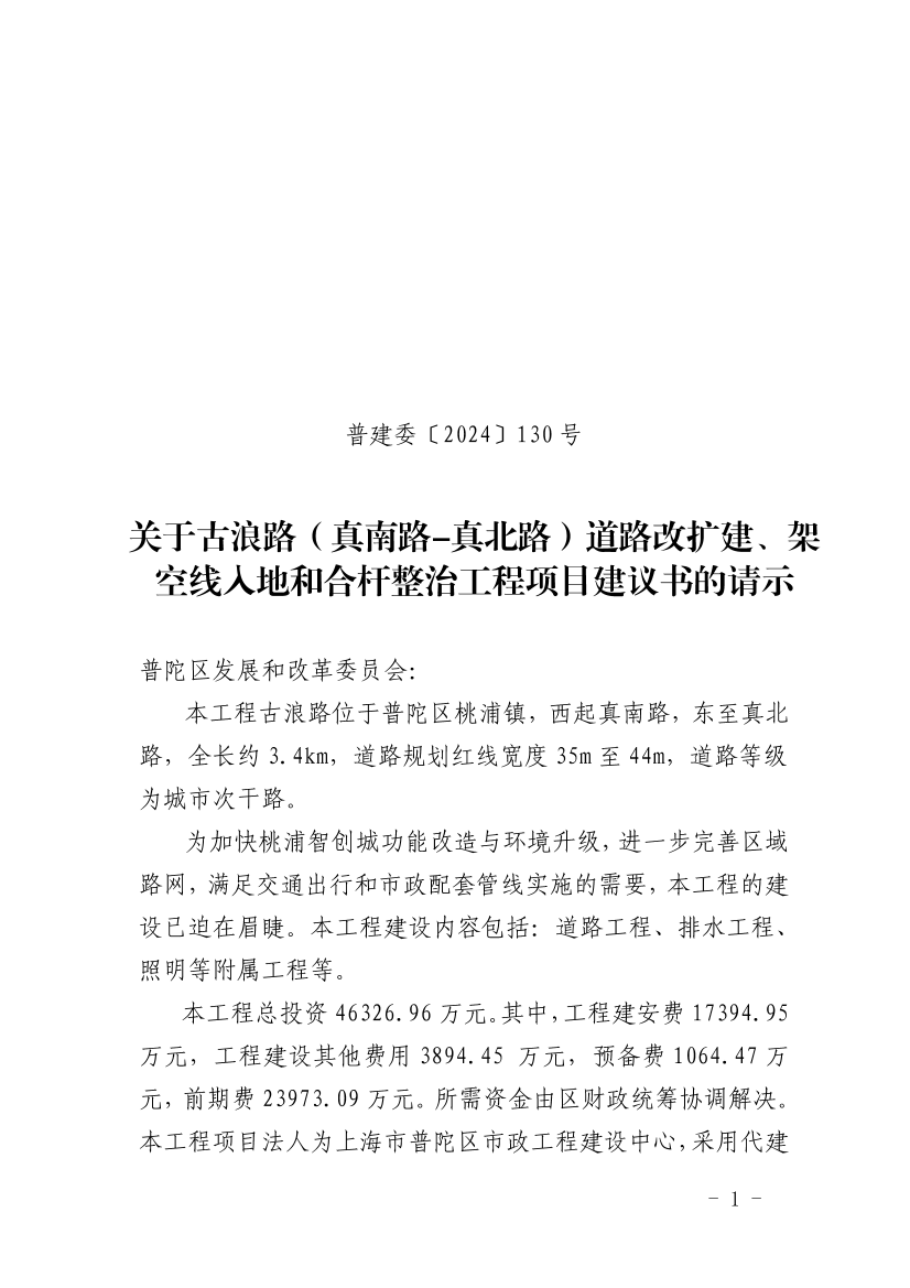 关于古浪路(真南路-真北路)道路改扩建、架空线入地和合杆整治工程项目建议书的请示