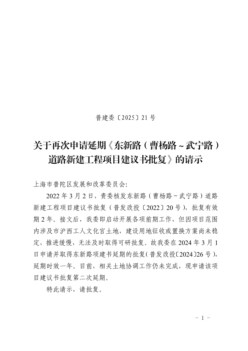 关于再次申请延期《东新路(曹杨路~武宁路)道路新建工程项目建议书批复》的请示