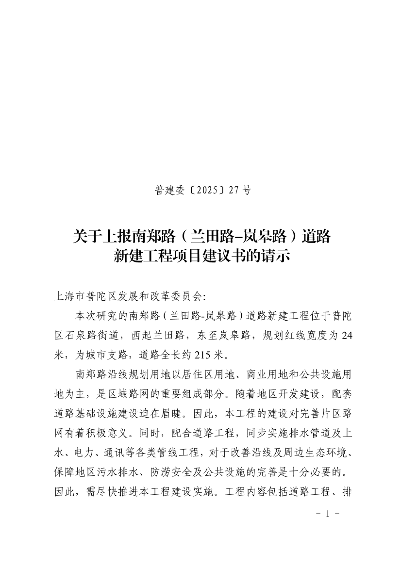 关于上报南郑路(兰田路-岚皋路)道路新建工程项目建议书的请示