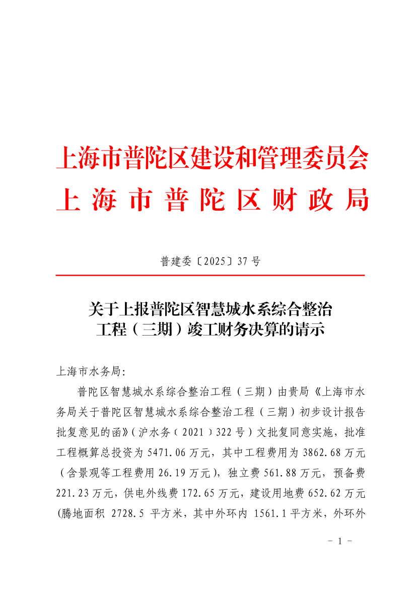 关于上报普陀区智慧城水系综合整治工程(三期)竣工财务决算的请示