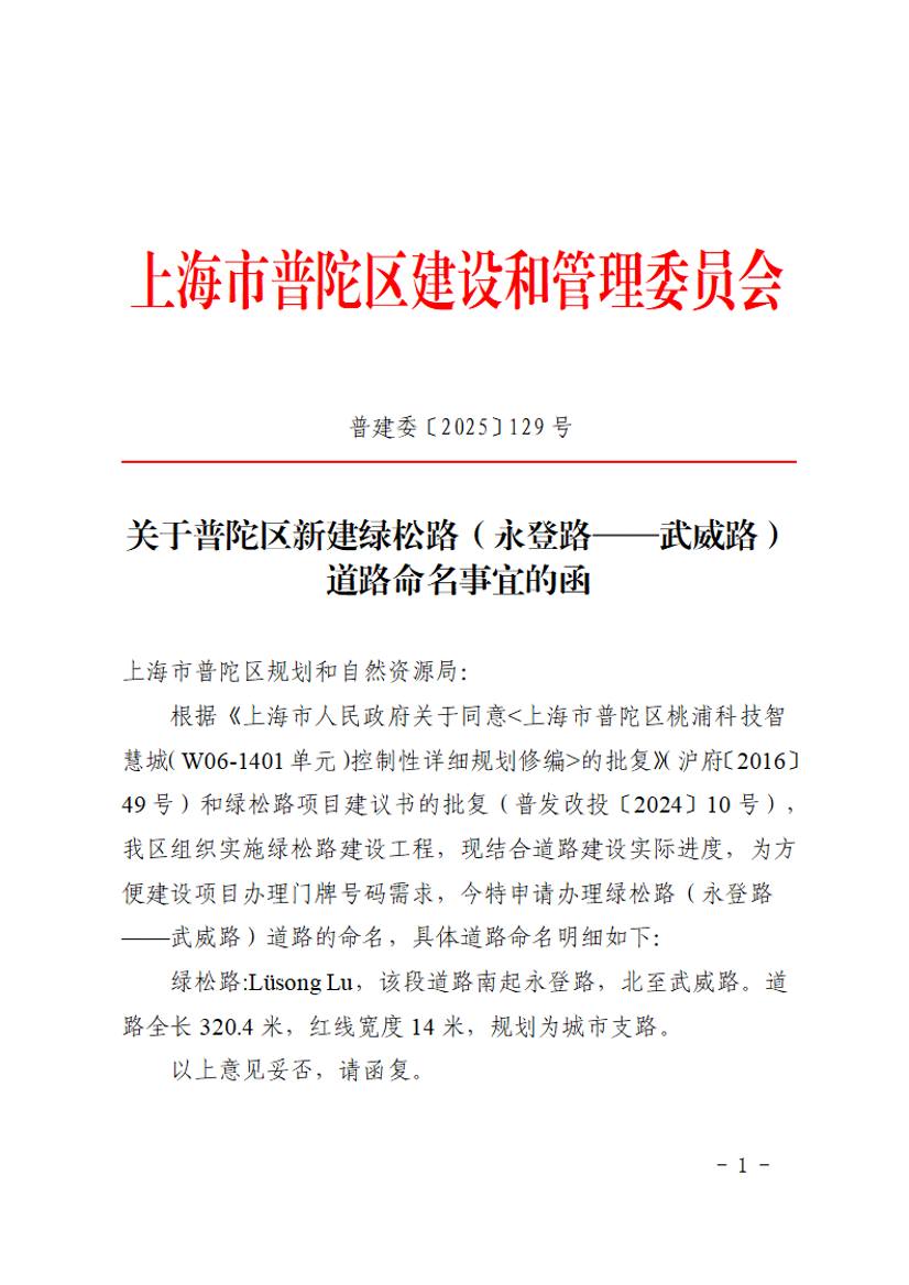 根据《上海市人民政府关于同意<上海市普陀区桃浦科技智慧城(W06-1401单元)控制性详细规划修编>的批复》(沪府〔2016〕49号)和绿松路项目建议书的批复(普发改投〔2024〕10号),我区组织实施绿松路建设工程,现结合道路建设实际进度,为方便建设项目办理门牌号码需求,今特申请办理绿松路(永登路——武威路)道路的命名,具体道路命名明细如下: