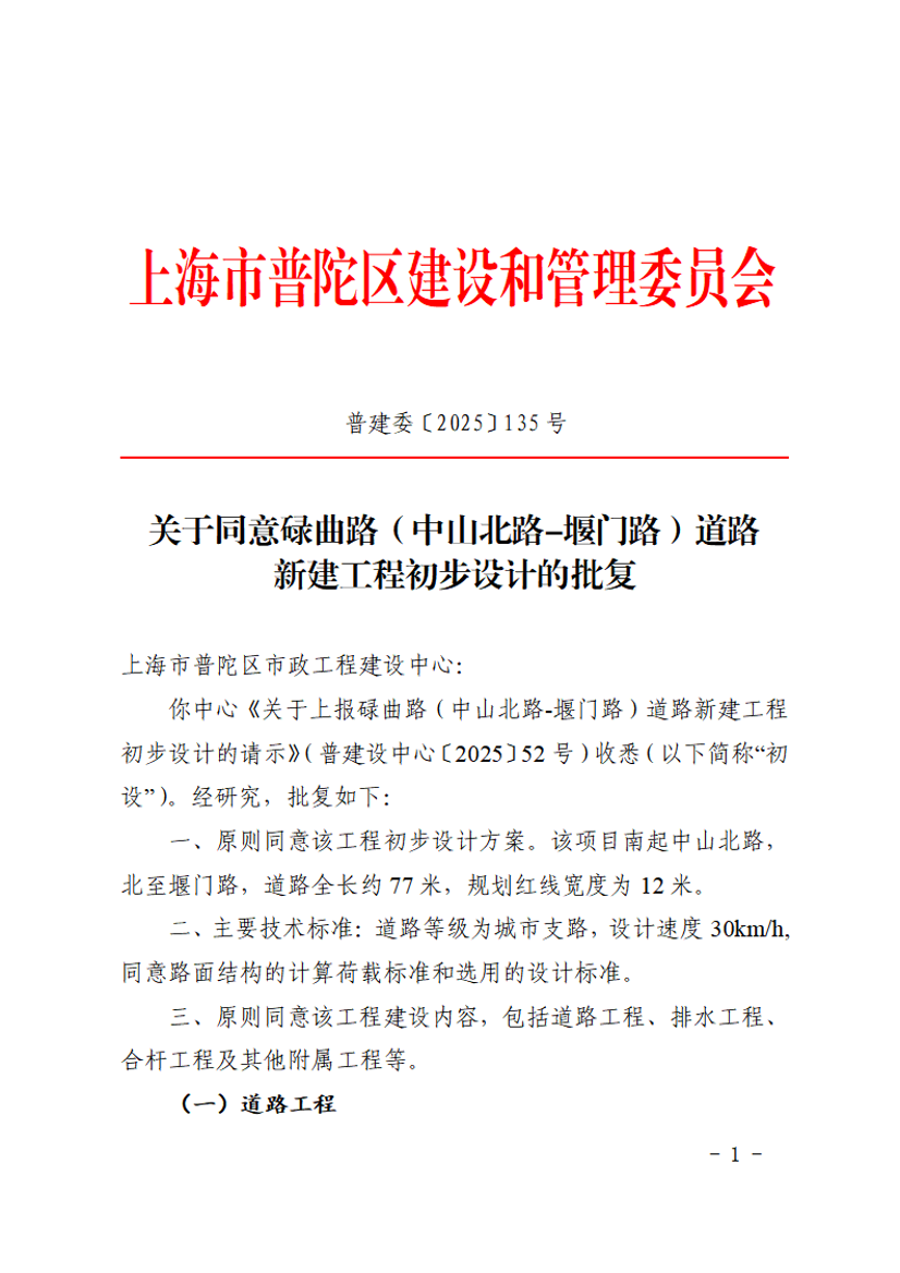 你中心《关于上报碌曲路(中山北路-堰门路)道路新建工程初步设计的请示》(普建设中心〔2025〕52号)收悉(以下简称“初设”)。经研究,批复如下: