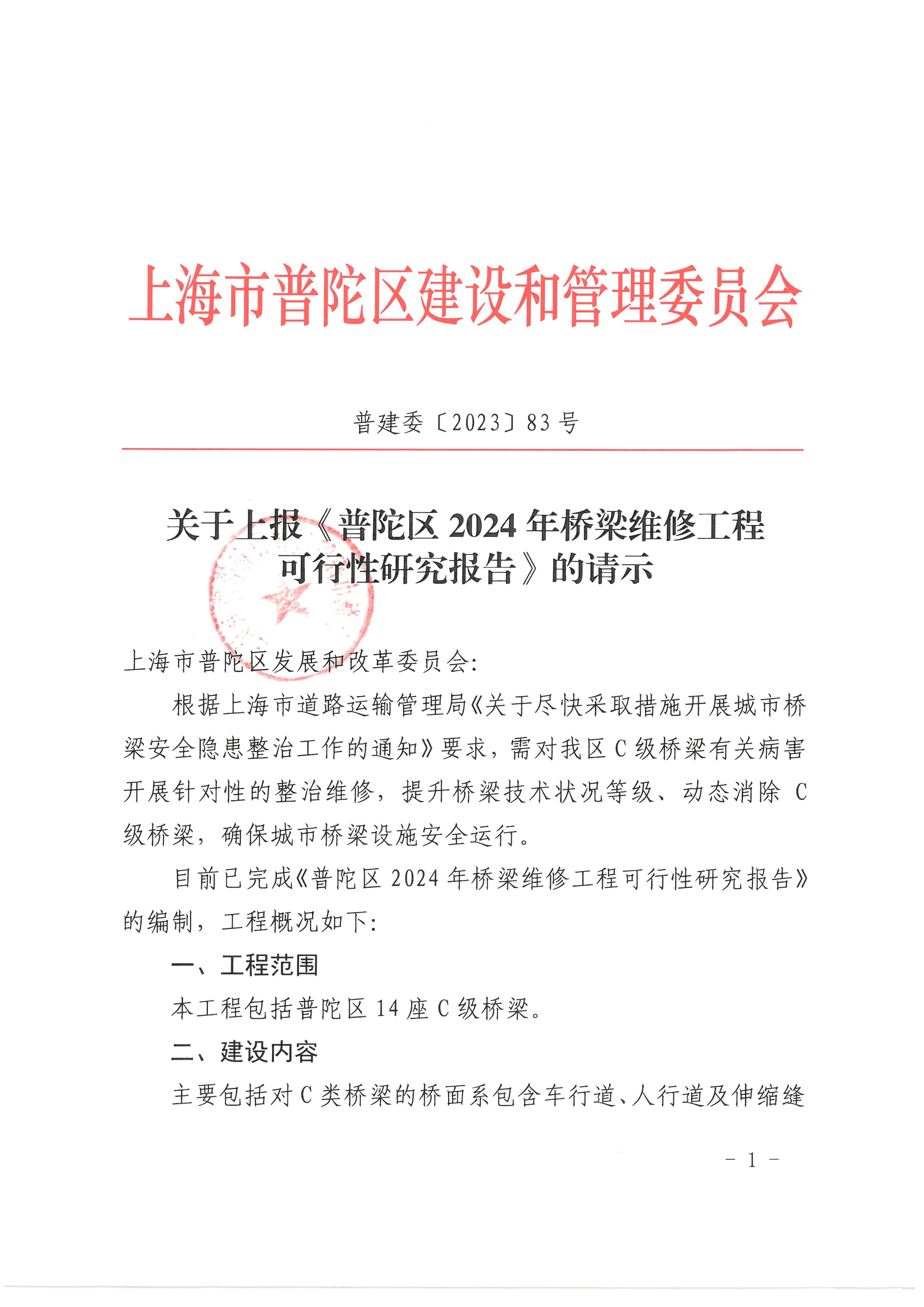 关于上报《普陀区2024年桥梁维修工程可行性研究报告》的请示