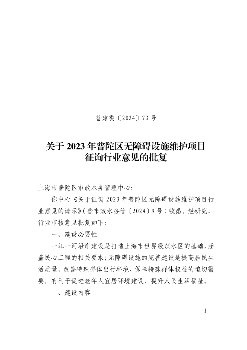 你中心《关于征询2023年普陀区无障碍设施维护项目行业意见的请示》(普市政水务管〔2024〕9号)收悉。经研究,行业审核意见批复如下: