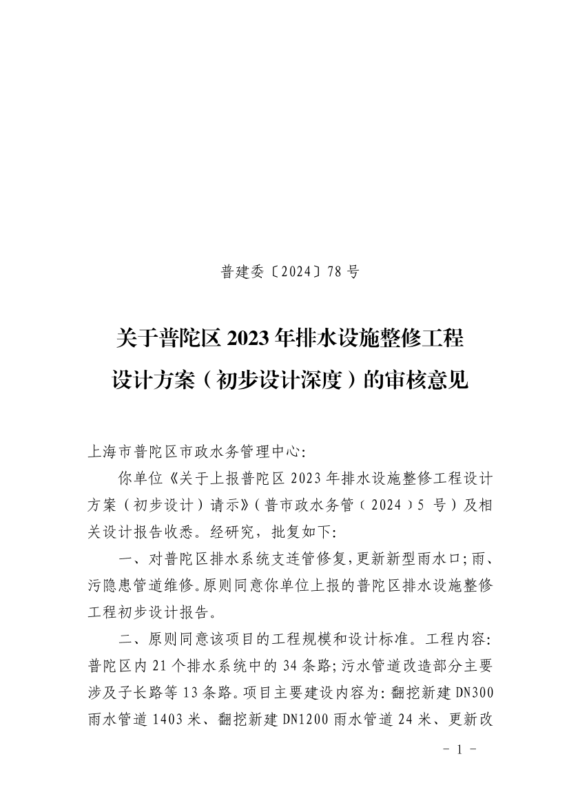 你单位《关于上报普陀区2023年排水设施整修工程设计方案(初步设计)请示》(普市政水务管﹝2024﹞5号)及相关设计报告收悉。经研究,批复如下: