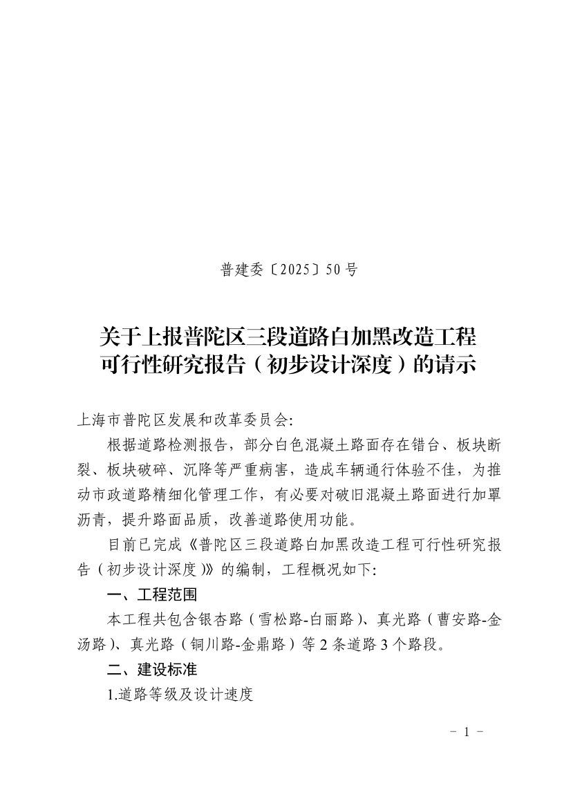 关于上报普陀区三段道路白加黑改造工程 可行性研究报告(初步设计深度)的请示