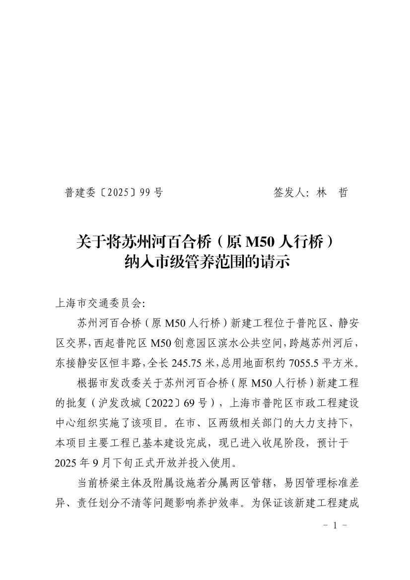 关于将苏州河百合桥(原M50人行桥) 纳入市级管养范围的请示