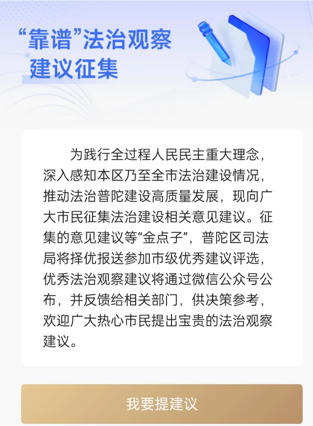 举例二:1.点击【我要提建议】2.进入提交页面,填写【工作单位、职务】(选填),语音或手动填写建议信息:【建议名称、基本情况、存在问题、意见建议】,完成建议的信息填写。3.点击【我的记录】,可查看已提交完成的靠谱法治观察建议记录。