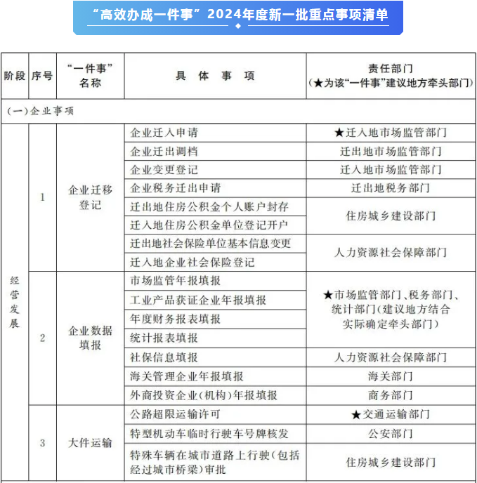 《“高效办成一件事”2024年度新一批重点事项清单》已经国务院同意,现印发给你们,请结合实际认真组织实施。
