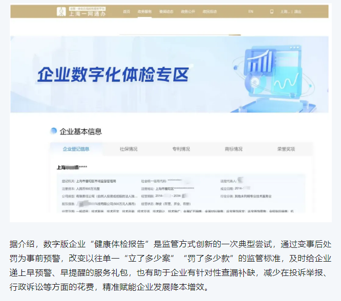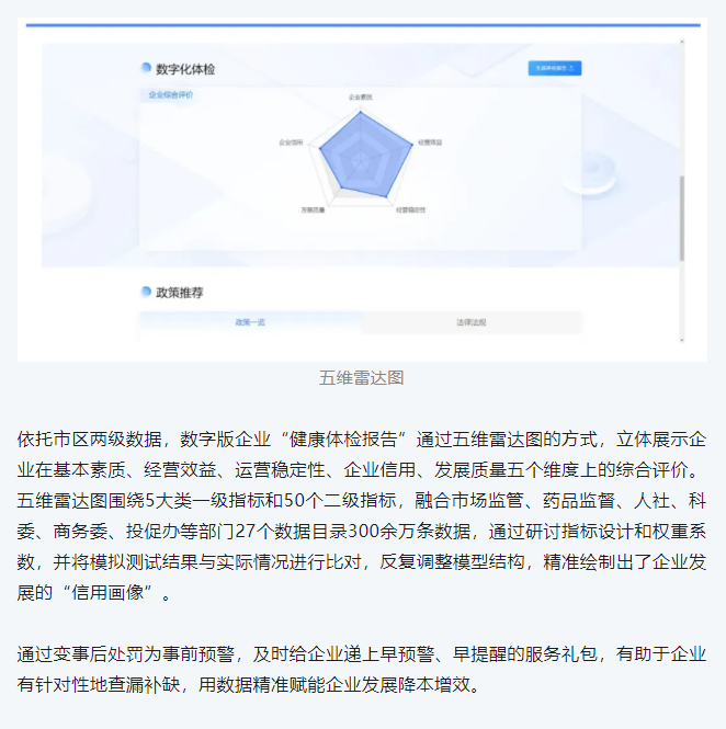 为进一步优化营商环境,推进服务型、智慧型监管,区数据局通过技术支撑和数据赋能,助力区市场监管局创新监管方式,在“一网通办”平台上线数字版企业“健康体检报告”。