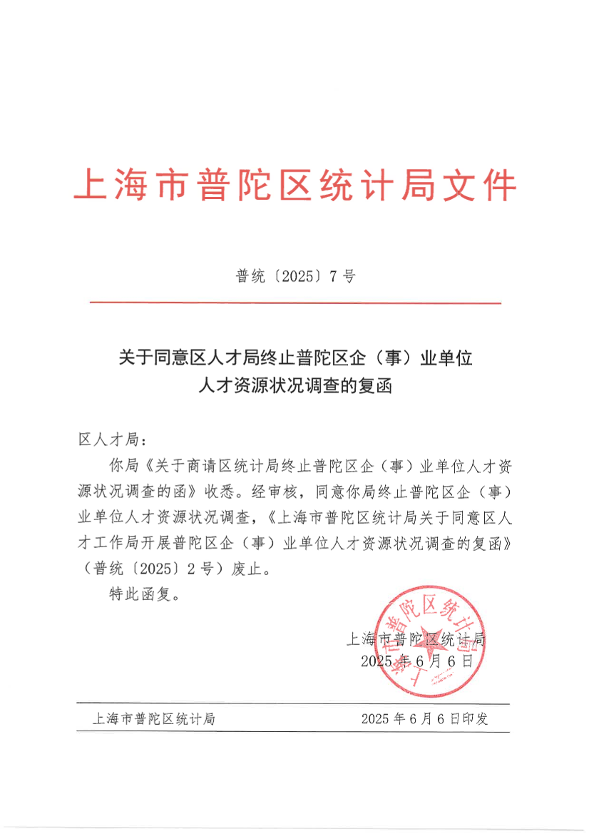 你局《关于商请区统计局终止普陀区企(事)业单位人才资源状况调查的函》收悉。经审核,同意你局终止普陀区企(事)业单位人才资源状况调查,《上海市普陀区统计局关于同意区人才工作局开展普陀区企(事)业单位人才资源状况调查的复函》(普统〔2025〕2号)废止。