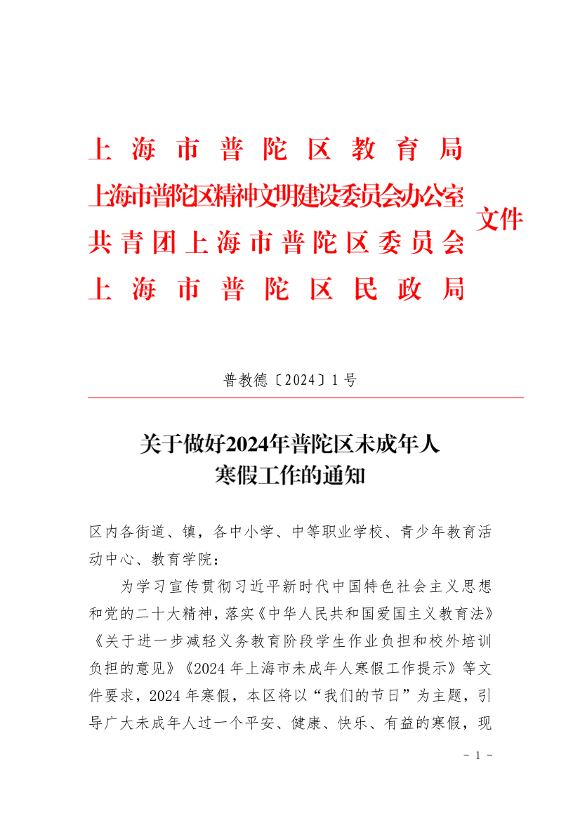 为学习宣传贯彻习近平新时代中国特色社会主义思想和党的二十大精神,落实《中华人民共和国爱国主义教育法》《关于进一步减轻义务教育阶段学生作业负担和校外培训负担的意见》《2024年上海市未成年人寒假工作提示》等文件要求,2024年寒假,本区将以“我们的节日”为主题,引导广大未成年人过一个平安、健康、快乐、有益的寒假,现将有关要求通知如下: