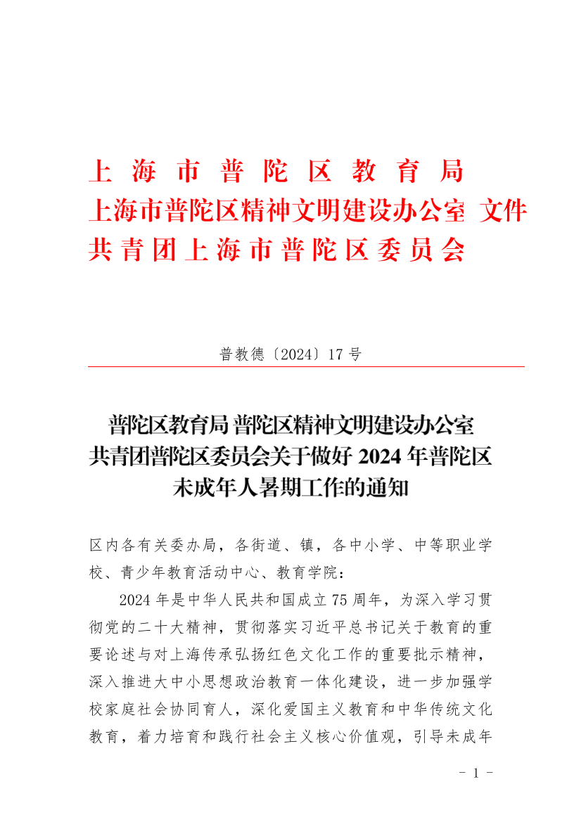 关于做好2024年普陀区未成年人暑期工作的通知