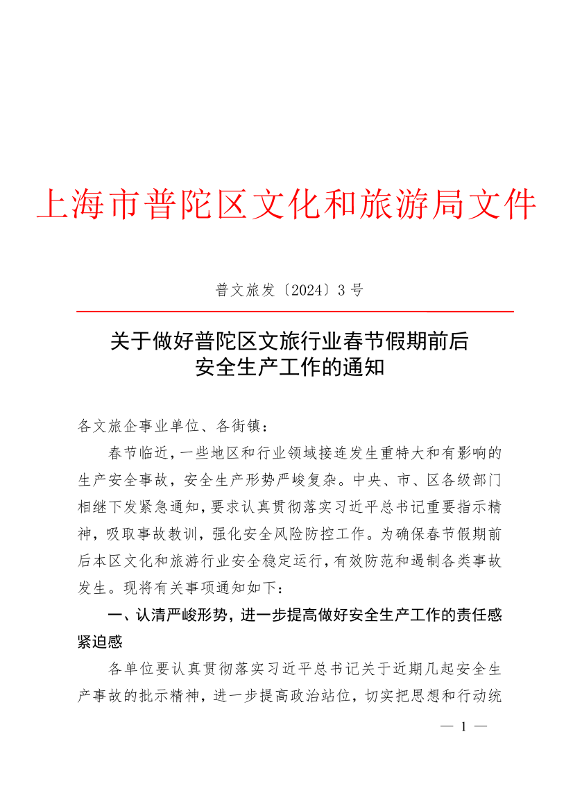 关于做好普陀区文旅行业春节假期前后安全生产工作的通知
