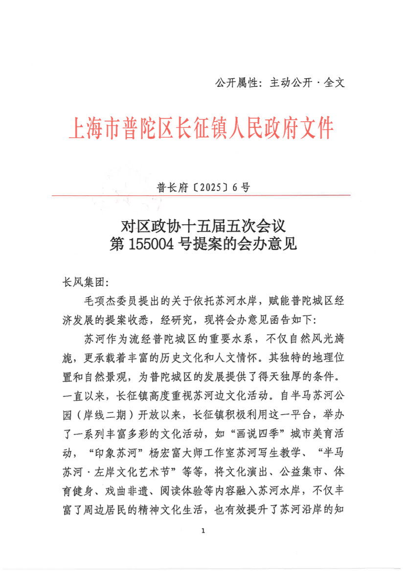 毛项杰委员提出的关于依托苏河水岸,赋能普陀城区经济发展的提案收悉,经研究,现将会办意见函告如下: