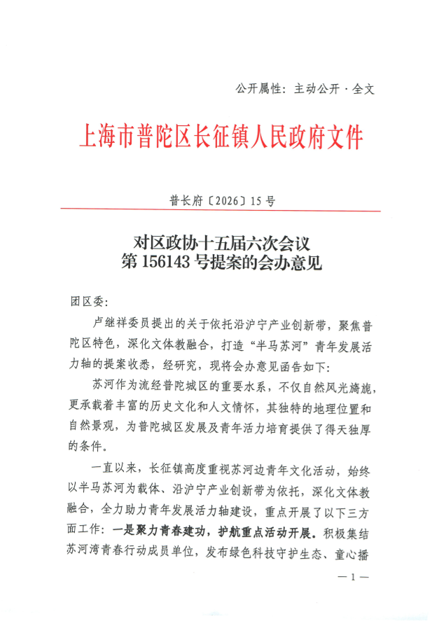 卢继祥委员提出的关于依托沿沪宁产业创新带,聚焦普陀区特色,深化文体教融合,打造“半马苏河”青年发展活力轴的提案收悉,经研究,现将会办意见函告如下: