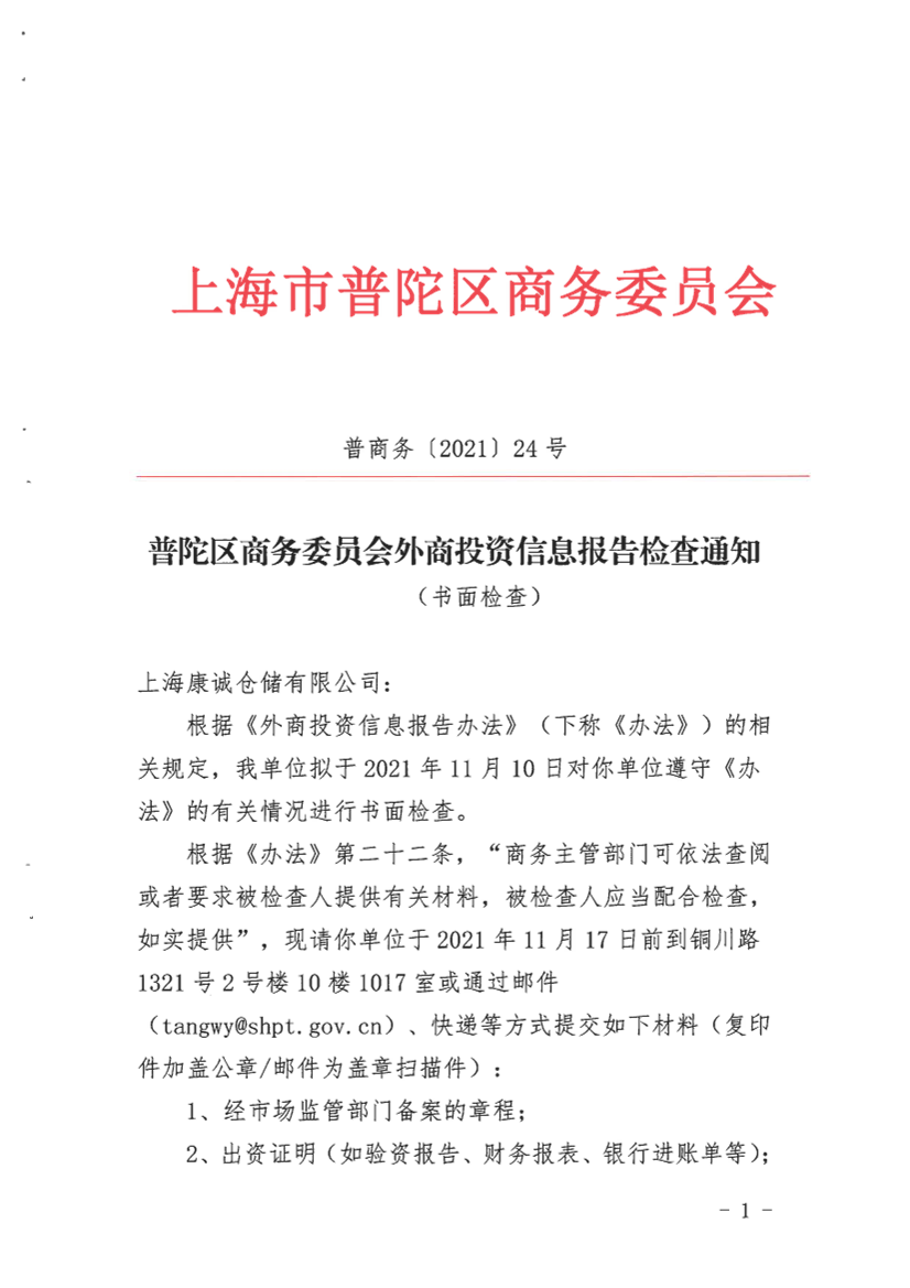 根据《办法》第二十二条,“商务主管部门可依法查阅或者要求被检查人提供有关材料,被检查人应当配合检查,如实提供”,现请你单位于2021年11月17日前到铜川路1321号2号楼10楼1017室或通过邮件(tangwy@shpt.gov.cn)、快递等方式提交如下材料(复印件加盖公章/邮件为盖章扫描件):