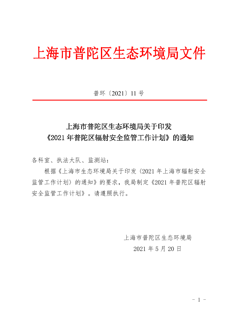 上海市普陀区生态环境局关于印发《2021年普陀区辐射安全监管工作计划》的通知
