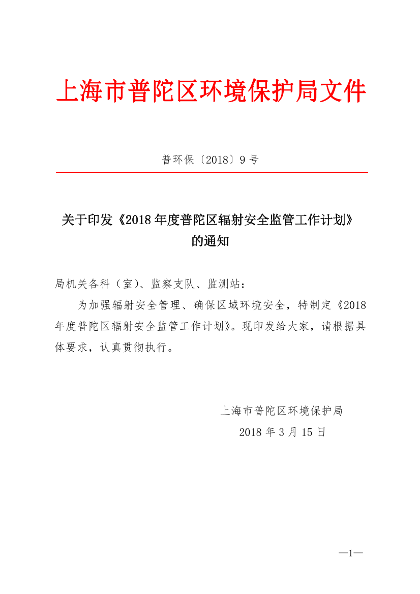 关于印发《2018年度普陀区辐射安全监管工作计划》的通知