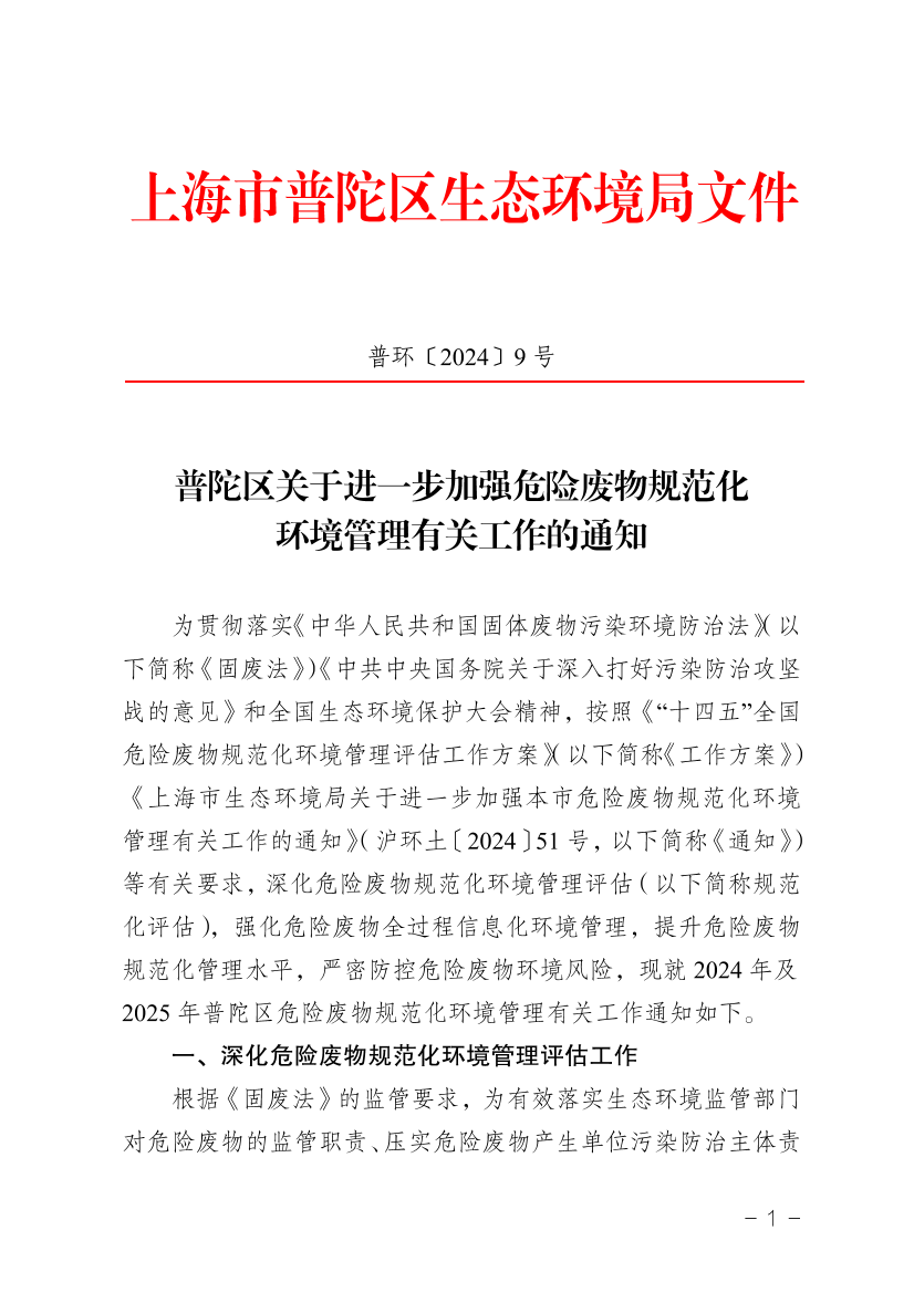 为贯彻落实《中华人民共和国固体废物污染环境防治法》(以下简称《固废法》)《中共中央国务院关于深入打好污染防治攻坚战的意见》和全国生态环境保护大会精神,按照《“十四五”全国危险废物规范化环境管理评估工作方案》(以下简称《工作方案》)《上海市生态环境局关于进一步加强本市危险废物规范化环境管理有关工作的通知》(沪环土〔2024〕51号,以下简称《通知》)等有关要求,深化危险废物规范化环境管理评估(以下简称规范化评估),强化危险废物全过程信息化环境管理,提升危险废物规范化管理水平,严密防控危险废物环境风险,现就2024年及2025年普陀区危险废物规范化环境管理有关工作通知如下。