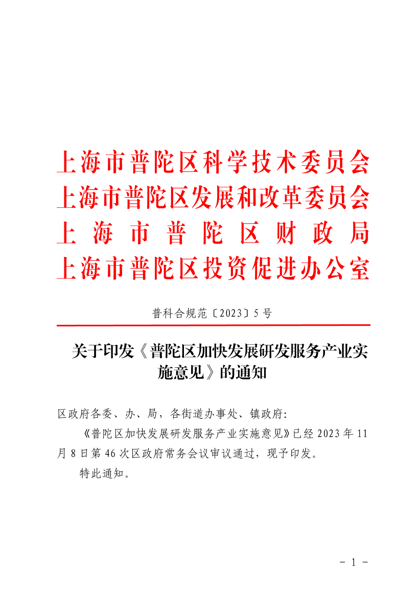 《普陀区加快发展研发服务产业实施意见》已经2023年11月8日第46次区政府常务会议审议通过,现予印发。
