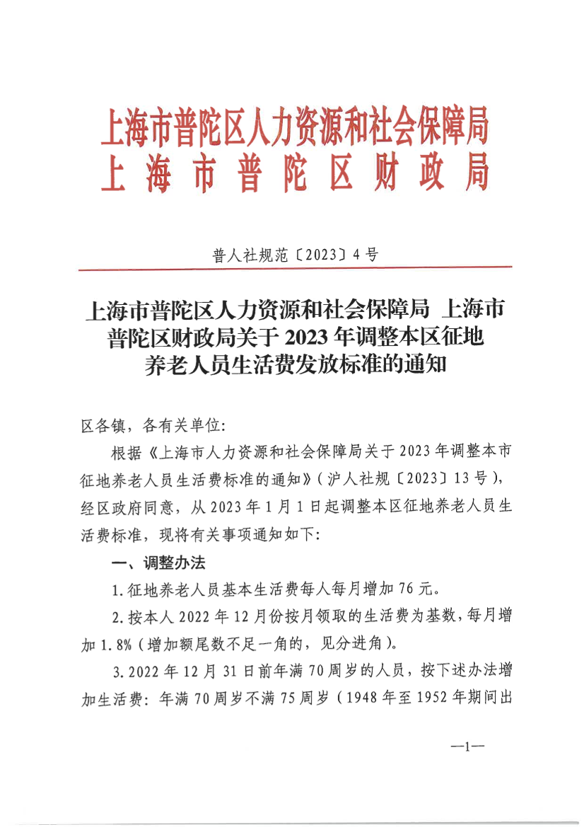上海市普陀区人力资源和社会保障局 上海市普陀区财政局关于2023年调整本区征地养老人员生活费发放标准的通知