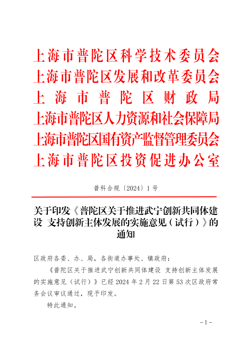 关于印发《普陀区关于推进武宁创新共同体建设 支持创新主体发展的实施意见(试行)》的通知