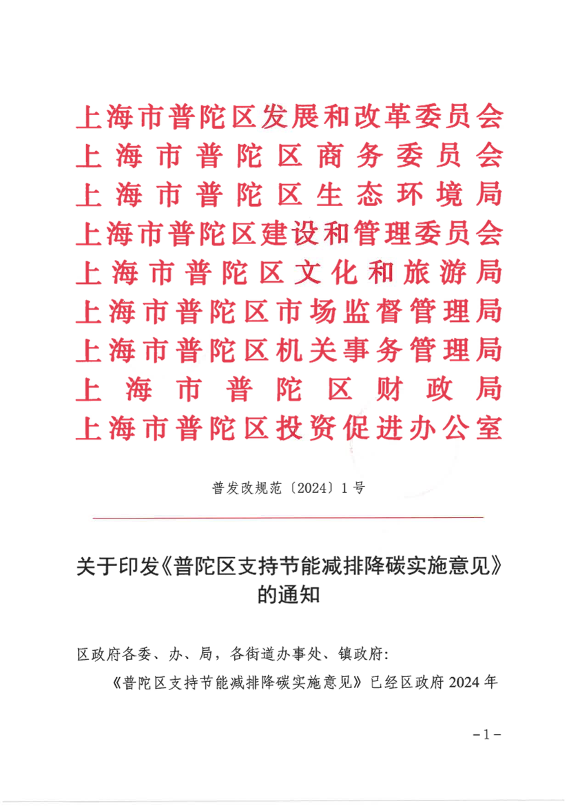 关于印发《普陀区支持节能减排降碳实施意见》的通知