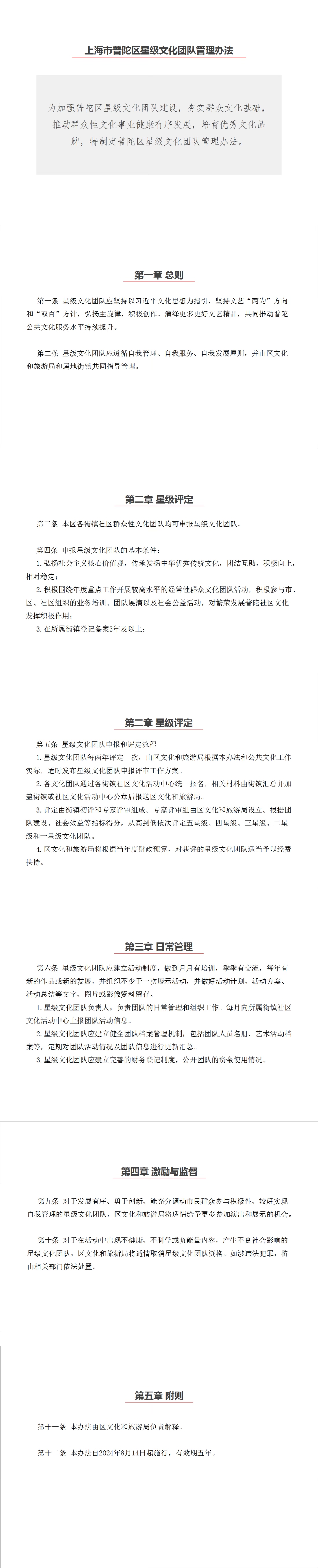 答:为加强普陀区星级文化团队建设,夯实群众文化基础,推动群众性文化事业健康有序发展,培育优秀文化品牌,特制定普陀区星级文化团队管理办法。
