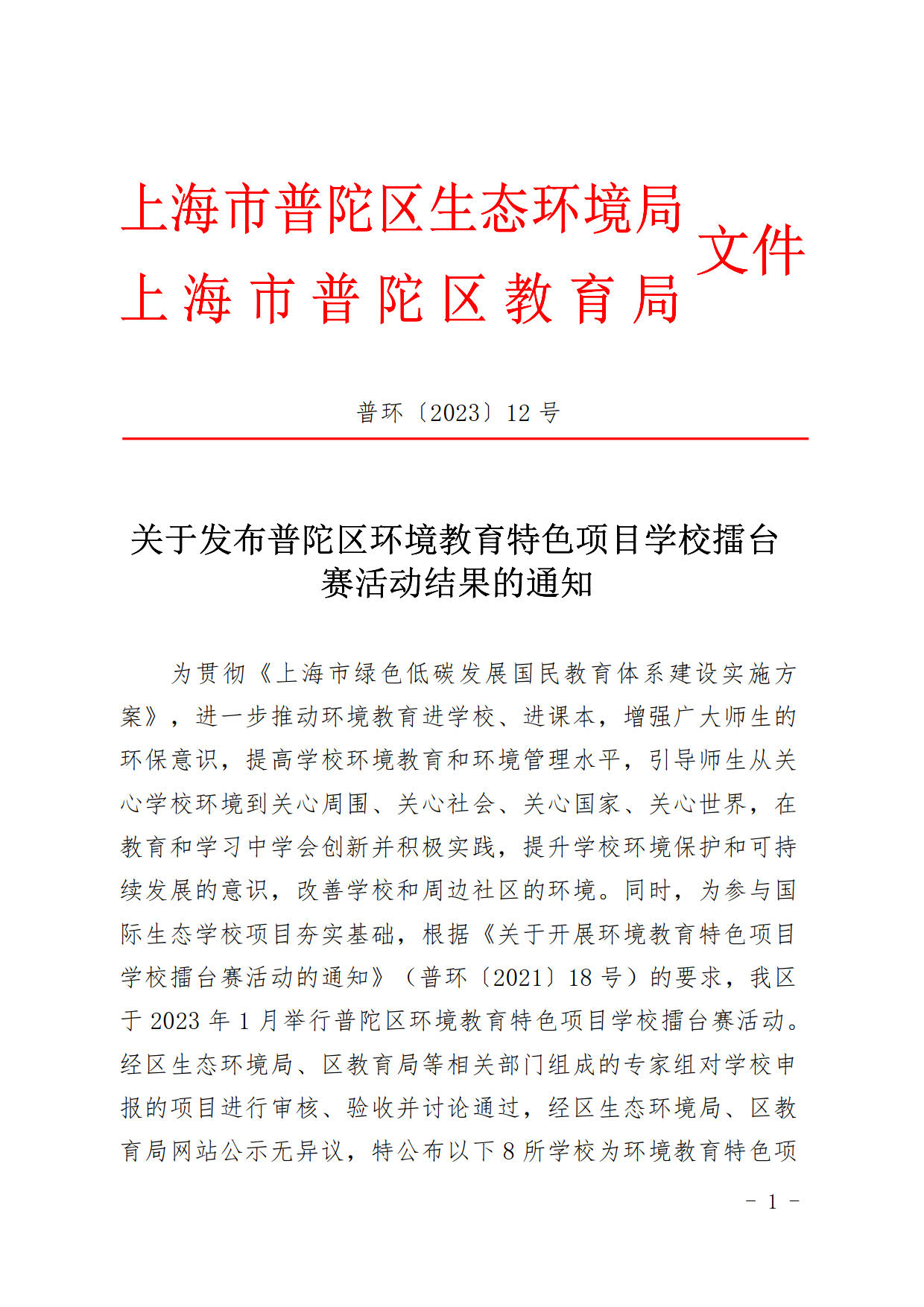 为贯彻《上海市绿色低碳发展国民教育体系建设实施方案》,进一步推动环境教育进学校、进课本,增强广大师生的环保意识,提高学校环境教育和环境管理水平,引导师生从关心学校环境到关心周围、关心社会、关心国家、关心世界,在教育和学习中学会创新并积极实践,提升学校环境保护和可持续发展的意识,改善学校和周边社区的环境。同时,为参与国际生态学校项目夯实基础,根据《关于开展环境教育特色项目学校擂台赛活动的通知》(普环〔2021〕18号)的要求,我区于2023年1月举行普陀区环境教育特色项目学校擂台赛活动。经区生态环境局、区教育局等相关部门组成的专家组对学校申报的项目进行审核、验收并讨论通过,经区生态环境局、区教育局网站公示无异议,特公布以下8所学校为环境教育特色项目学校(排名不分先后):