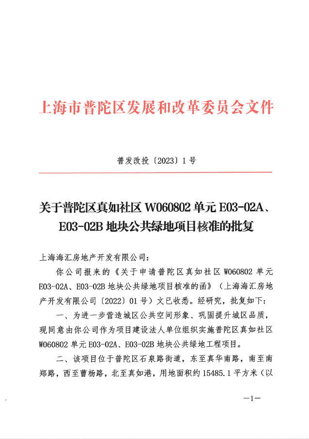 你公司报来的《关于申请普陀区真如社区W060802单元E03-02A、E03-02B地块公共绿地项目核准的函》(上海海汇房地产开发有限公司〔2022〕01号)文已收悉。经研究,批复如下: