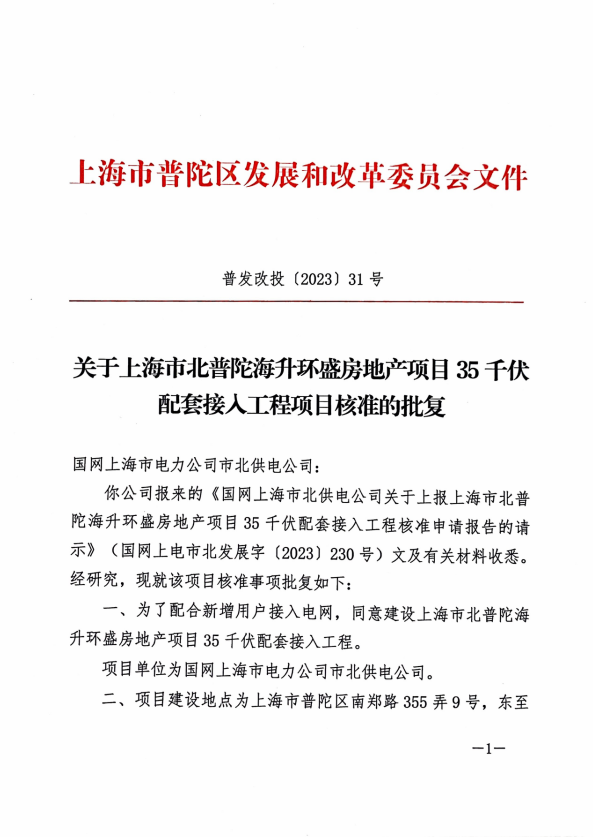 你公司报来的《国网上海市北供电公司关于上报上海市北普陀海升环盛房地产项目35千伏配套接入工程核准申请报告的请示》(国网上电市北发展字〔2023〕230号)文及有关材料收悉。经研究,现就该项目核准事项批复如下: