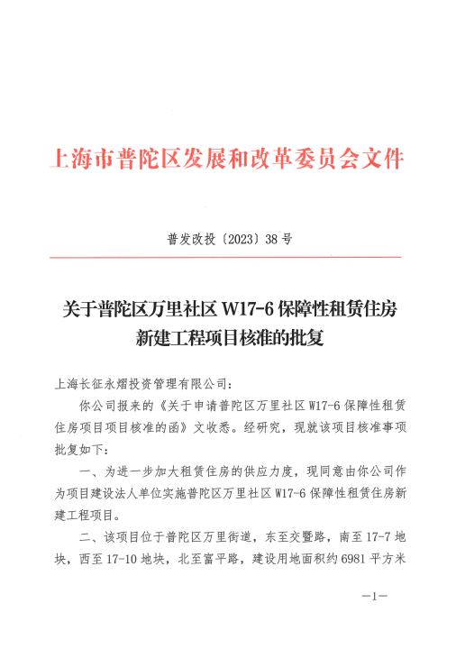 你公司报来的《关于申请普陀区万里社区W17-6保障性租赁住房项目项目核准的函》文收悉。经研究,现就该项目核准事项批复如下: