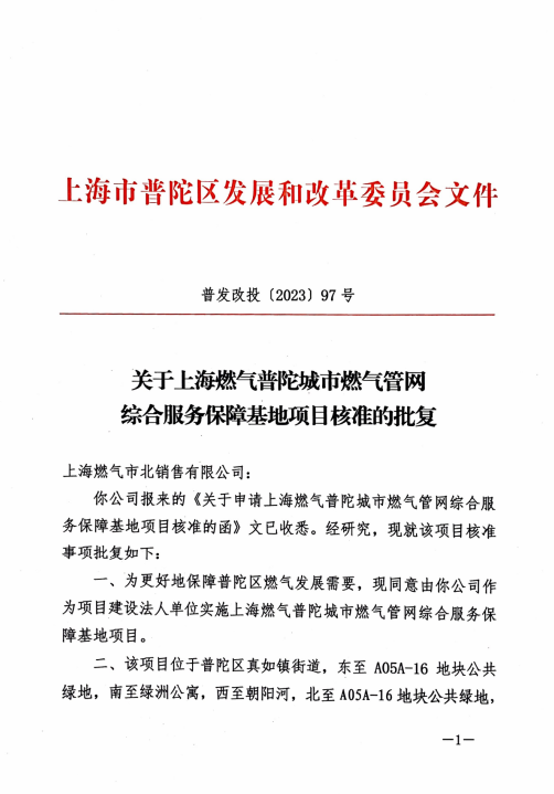 你公司报来的《关于申请上海燃气普陀城市燃气管网综合服务保障基地项目核准的函》文已收悉。经研究,现就该项目核准事项批复如下: