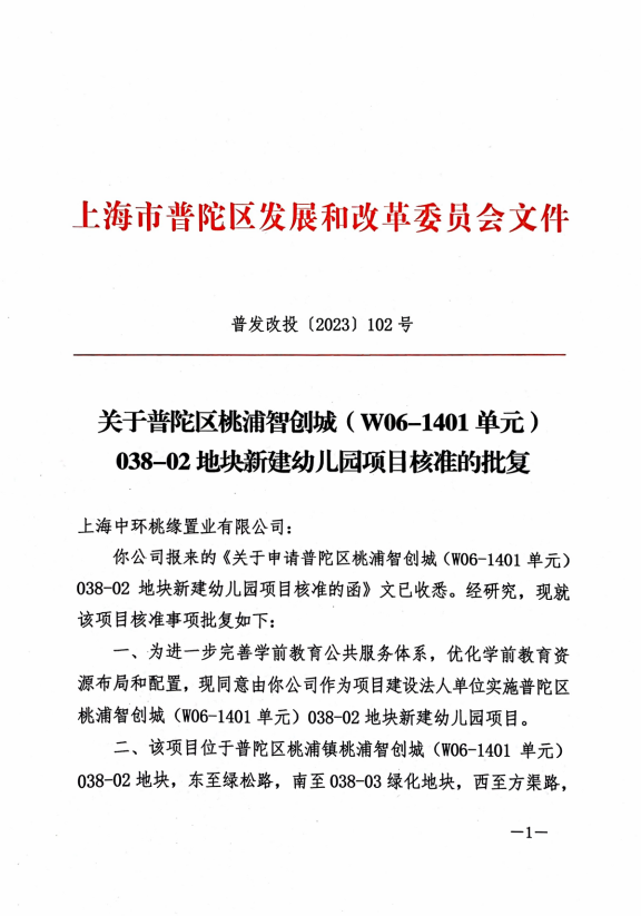 一、为进一步完善学前教育公共服务体系,优化学前教育资源布局和配置,现同意由你公司作为项目建设法人单位实施普陀区桃浦智创城(W06-1401单元)038-02地块新建幼儿园项目。
